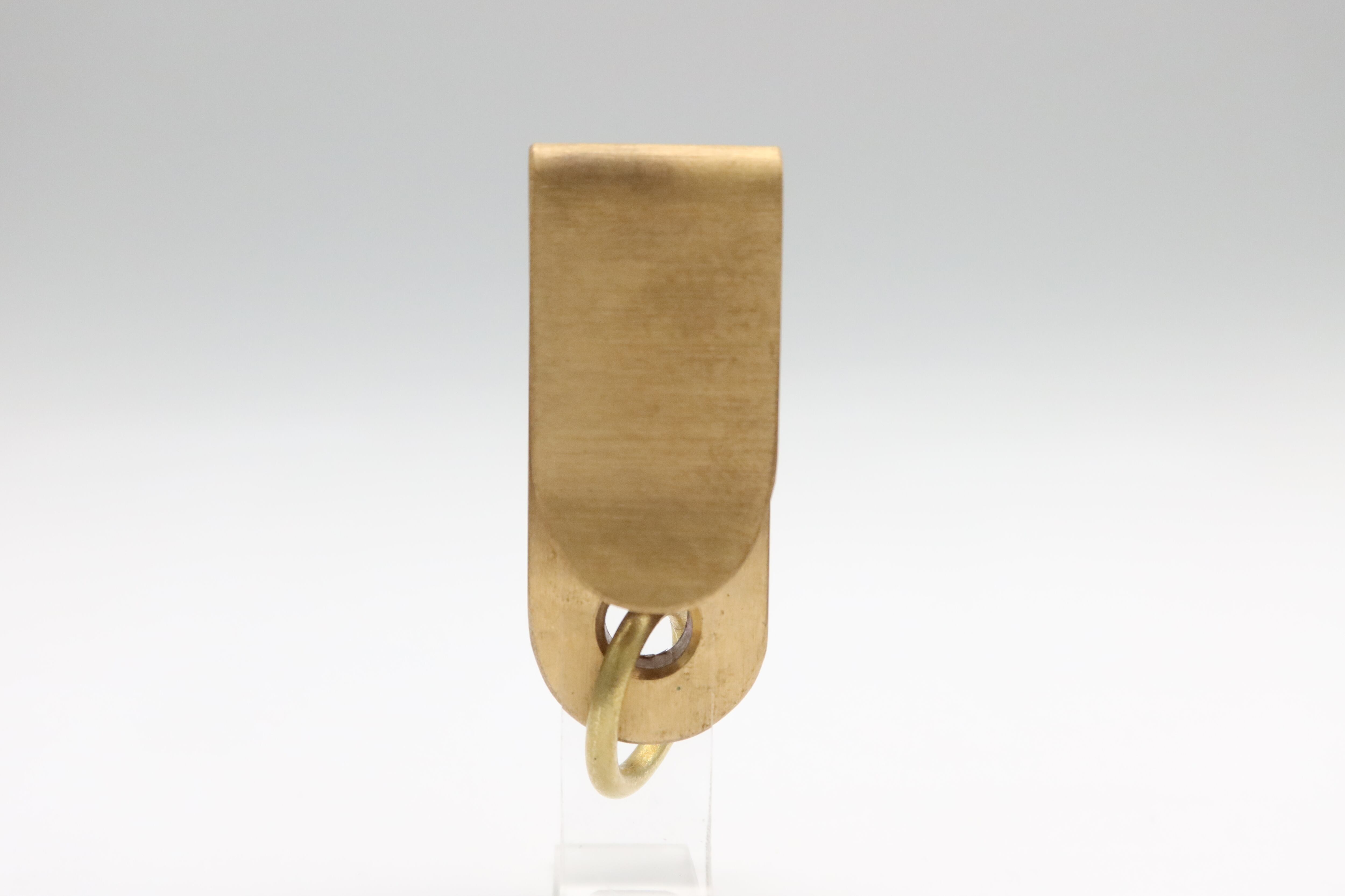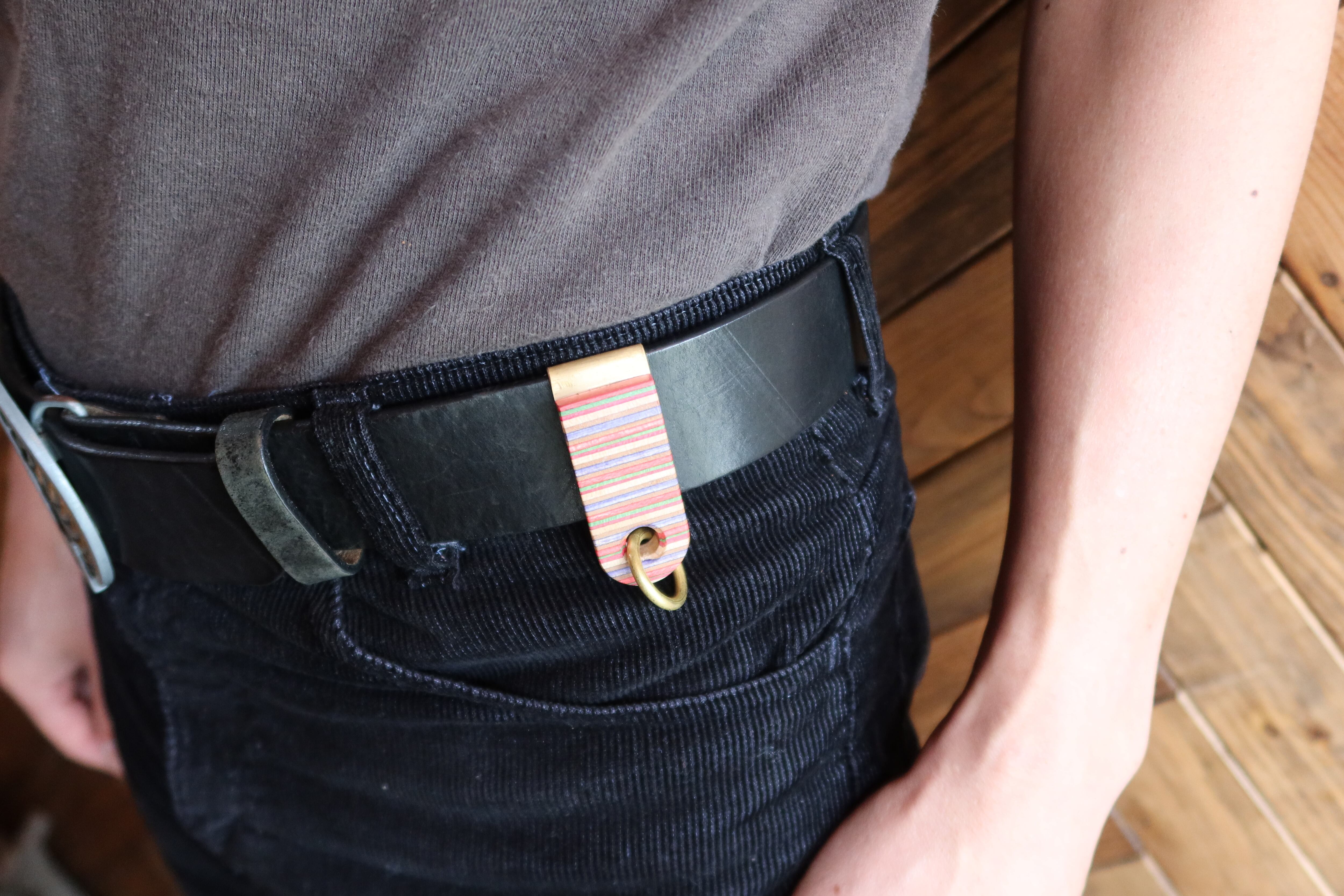 特徴:クリップ部分は真鍮板。スケボー板材に木ネジ(2ヶ所)と強力な接着剤で固定されている。主にベルトにクリップできるように作られているが、クリップ場所は貴方次第。