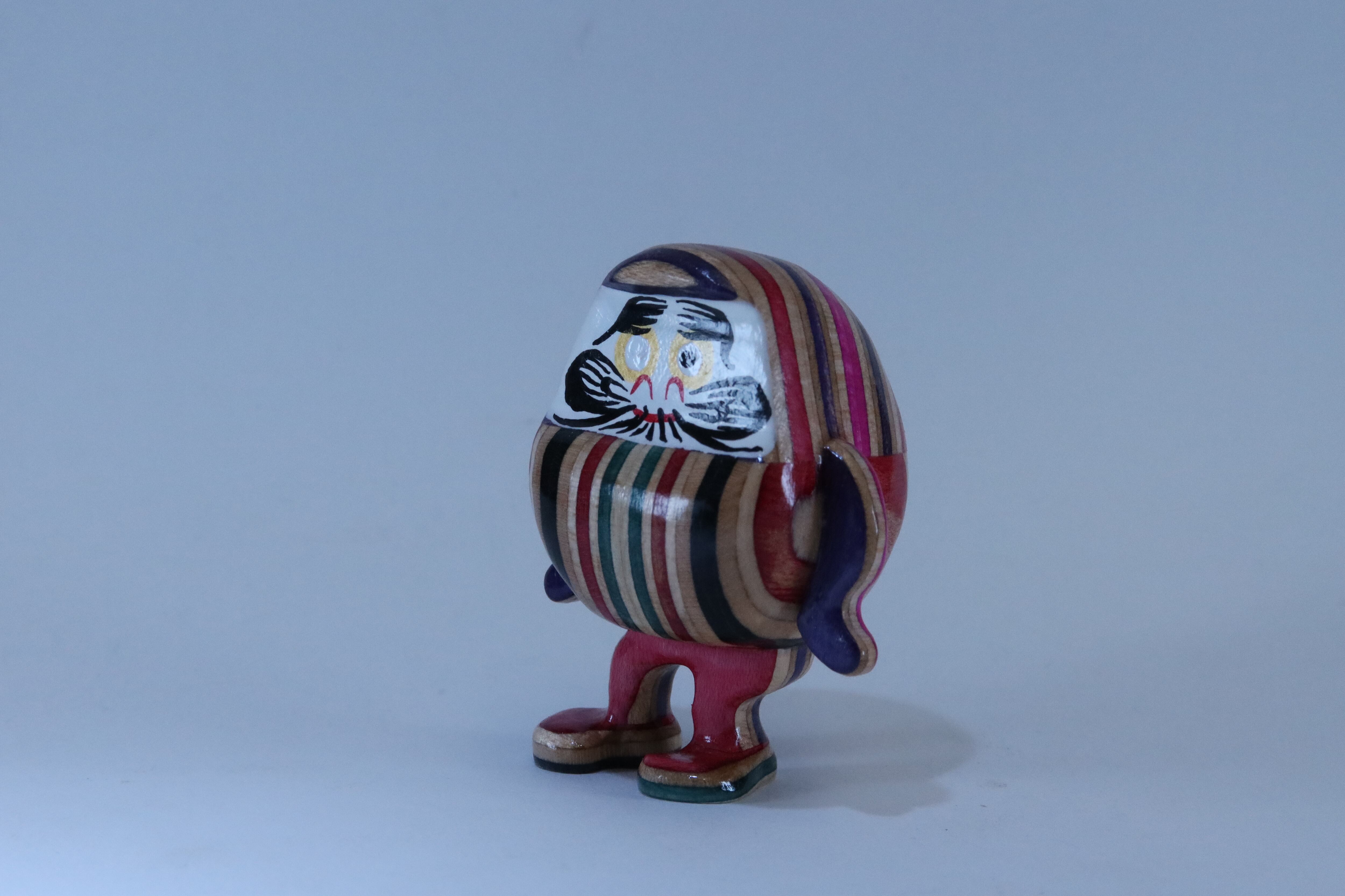 転んでも血だらけになっても平気なスケーターの不屈の魂を引き継ぎダルマとなったのが七転八滑君だ。ダルマのくせに「滑る」ので受験生には不向き。ただ「滑り終わった」スケボーから作られているので、浪人生にはオススメ。そんな七転八滑君に手足を付けちゃった作品。